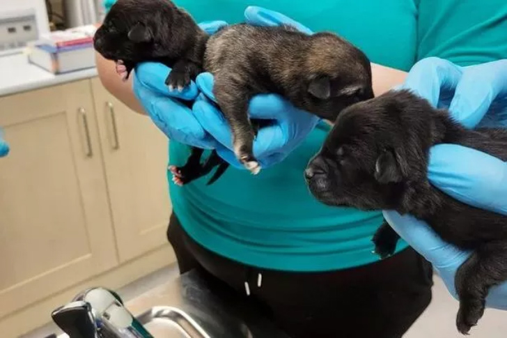 喜びの瞬間、一匹の子犬だけが動かず、声も出しませんでした。獣医チームに緊張が走り、「死産」という言葉が、重くクリニックにのしかかりました。トンプソン夫人は心配で顔を覆いました。
